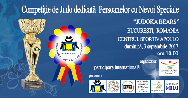 Bucuresti, 3 septembrie 2017, ora 10:00, Centrul Sportiv Apollo. Asociatia DOWN Bucuresti impreuna cu partenerii sai: Special Needs Judo Union, Federatia Romana de Judo, Fundatia pentru Tineret a Municipiului Bucuresti, Academia Olimpica Romana Filiala Bucuresti, Asociatia Angels Down si Asociatia Mihai va invita sa luati parte la aceasta competitie internationala dedicata persoanelor cu dizabilitati. S-au inscris peste 50 participanti din 6 tari inclusiv Romania.